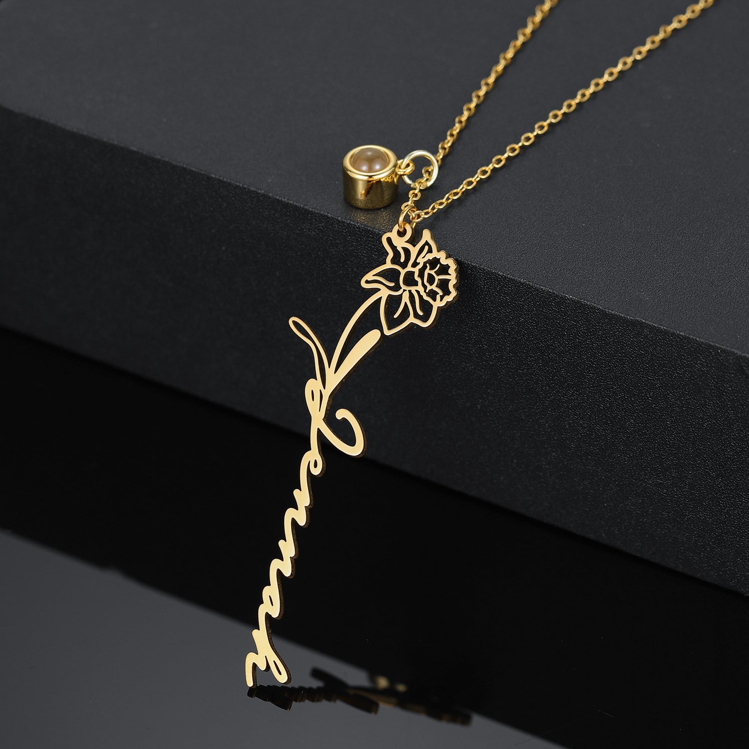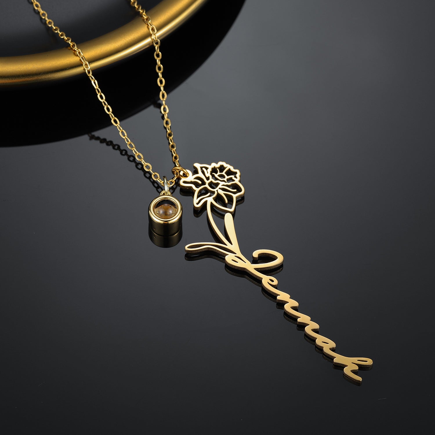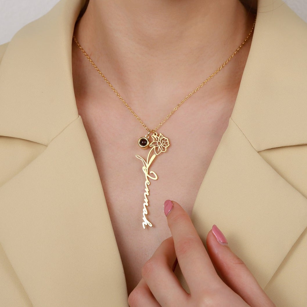 Personalize this name necklace with your birth flower, name, and even add a photo pendant with a custom picture inside. Look inside or use your phone's camera to reveal the picture!