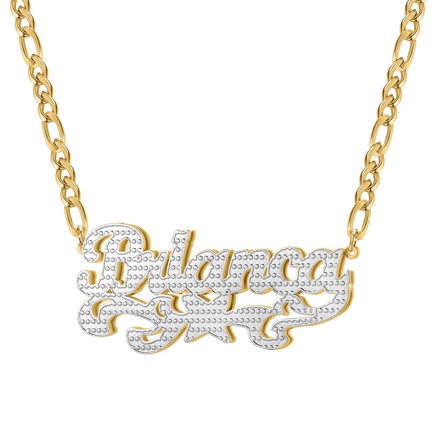 Make a statement with our new double plated collection! Personalize this figaro chain with your name, the name of a loved one, or a special word. Crafted from 18K gold and silver plating, this piece is made to last.